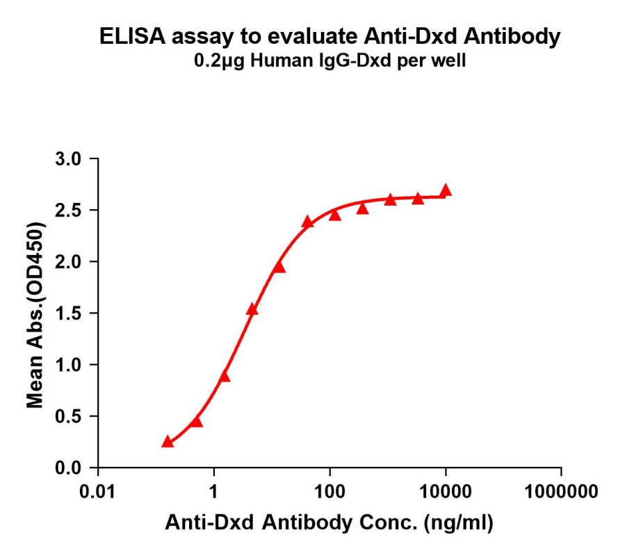 Figure 1. Elisa plates were pre-coated with IgG-Dxd (0.2μg/per well). Serial diluted anti-Dxd monoclonal antibody (DME101025) solutions were added, washed, and incubated with secondary antibody before Elisa reading. From above data, the EC50 for anti-Dxd monoclonal antibody binding with IgG-Dxd is 3.447ng/ml.