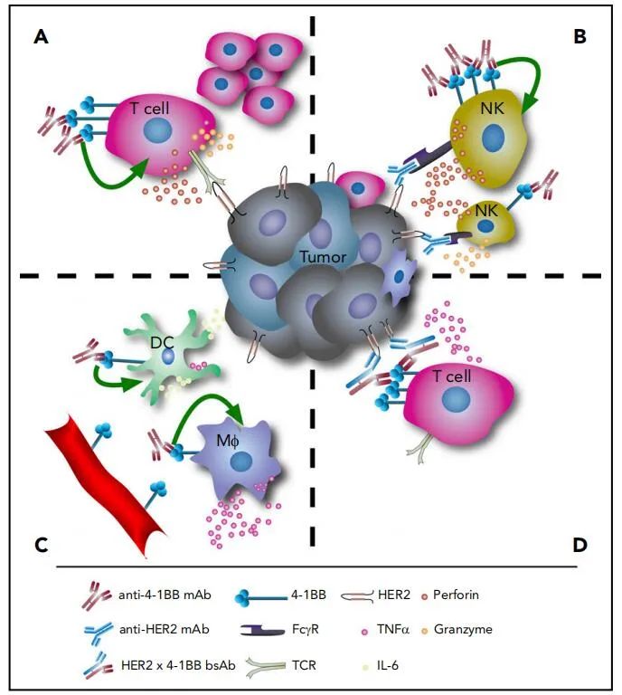 T細(xì)胞:抗4-1BB單抗誘導(dǎo)T細(xì)胞增殖和細(xì)胞因子分泌(A)。針對4-1BB和腫瘤抗原(如HER2)的雙特異性抗體可以使免疫效應(yīng)細(xì)胞近距離靶向腫瘤細(xì)胞,促進(jìn)腫瘤細(xì)胞溶解(D)。2