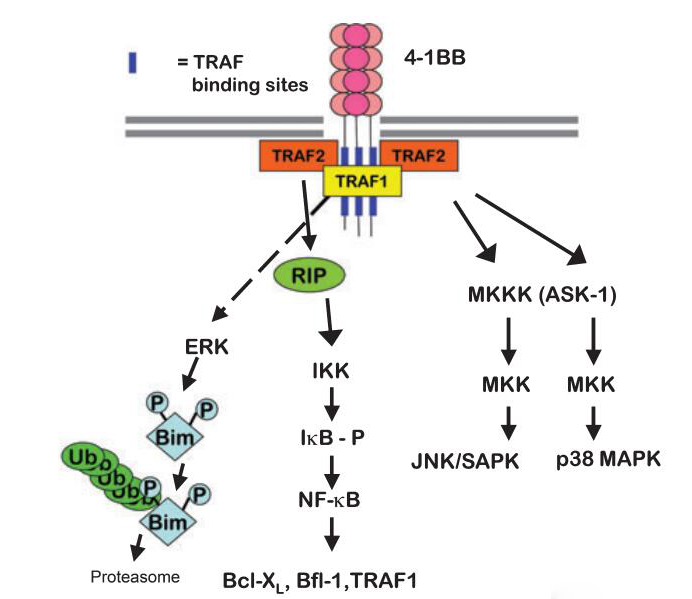 4-1BB聚集并招募TRAF1和TRAF2形成異源三聚體。TRAF2可以與ASK1相互作用并激活A(yù)SK1。ASK1可以激活下游信號級聯(lián),包括JNK/SAPK和P38 MAPK。