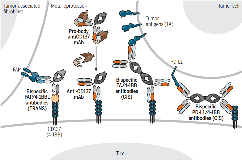 雙特異性抗體:靶向腫瘤抗原或腫瘤基質(zhì)成分的4-1BB雙特異性抗體,可使誘導(dǎo)的T細(xì)胞激活局限于表達(dá)靶抗原的組織,從而可減輕系統(tǒng)毒性。在小鼠模型中,靶向CD137和腫瘤相關(guān)抗原EGFR的第一個雙特異性結(jié)構(gòu)體顯示了療效和增強的免疫功能,且沒有明顯的肝臟副作用。這種方法的局限性在于,只能對表達(dá)腫瘤相關(guān)抗原的腫瘤有效。