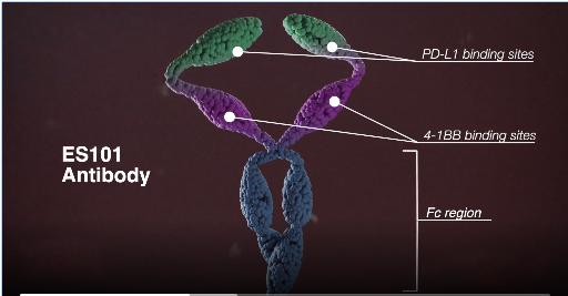 ES101最初由Inhibrx公司開發(fā),科望醫(yī)藥引進(jìn)其大中華區(qū)權(quán)益。ES101是一個靶向PD-L1/4-1BB的四價雙特異性抗體,包含4個結(jié)合域,其中兩個靶向PD-L1,另外兩個靶向4-1BB。