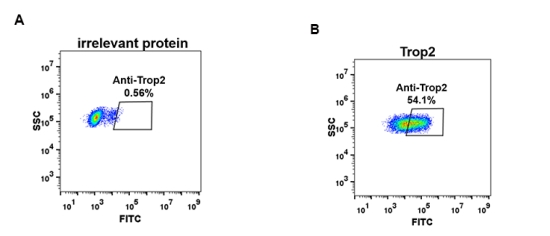 Figure 3. HEK293 cell line transfected with irrelevant protein (A) and human Trop2 (B) were surface stained with Rabbit anti-Trop2 monoclonal antibody 1μg/ml (clone: DM76) followed by Alexa 488-conjugated anti-rabbit IgG secondary antibody.