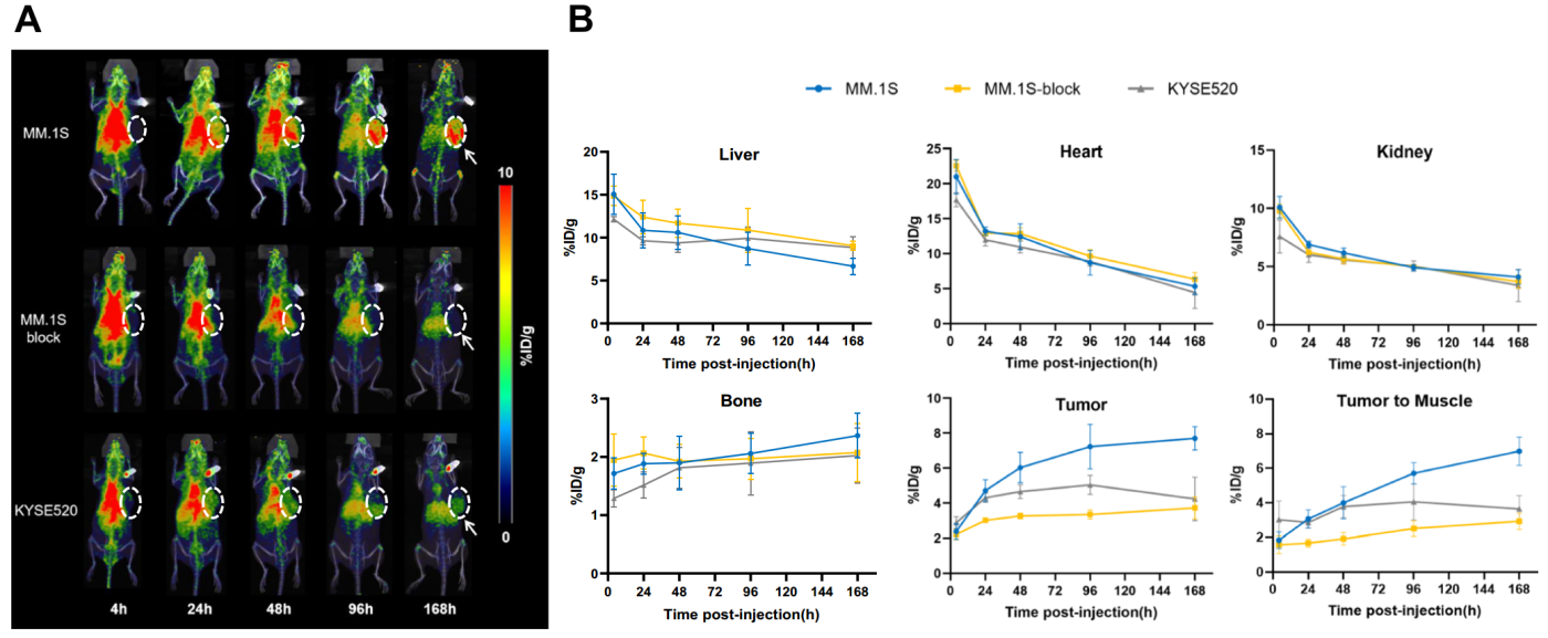 在完成細(xì)胞系的篩選及體外實驗驗證之后,作者團(tuán)隊構(gòu)建了MM.1S和 KYSE520 荷瘤模型,將細(xì)胞通過皮下注射到雌性 BALB/c 裸鼠(4 周齡)的側(cè)腹中建立腫瘤模型。而后采用PET顯像監(jiān)測了荷瘤模型在注射[89Zr]Zr-DFOBCMAh230430 后4至168小時內(nèi)不同時間點的成像,結(jié)果顯示注射 [89Zr]Zr-DFOBCMAh230430 后,腫瘤攝取顯著降低(Figure 3. A)。MM.1S 腫瘤在晚期時間點的腫瘤攝取量幾乎是 KYSE520 腫瘤的兩倍,且腫瘤與肌肉的比例具有相似的趨勢(Figure 3. B)。