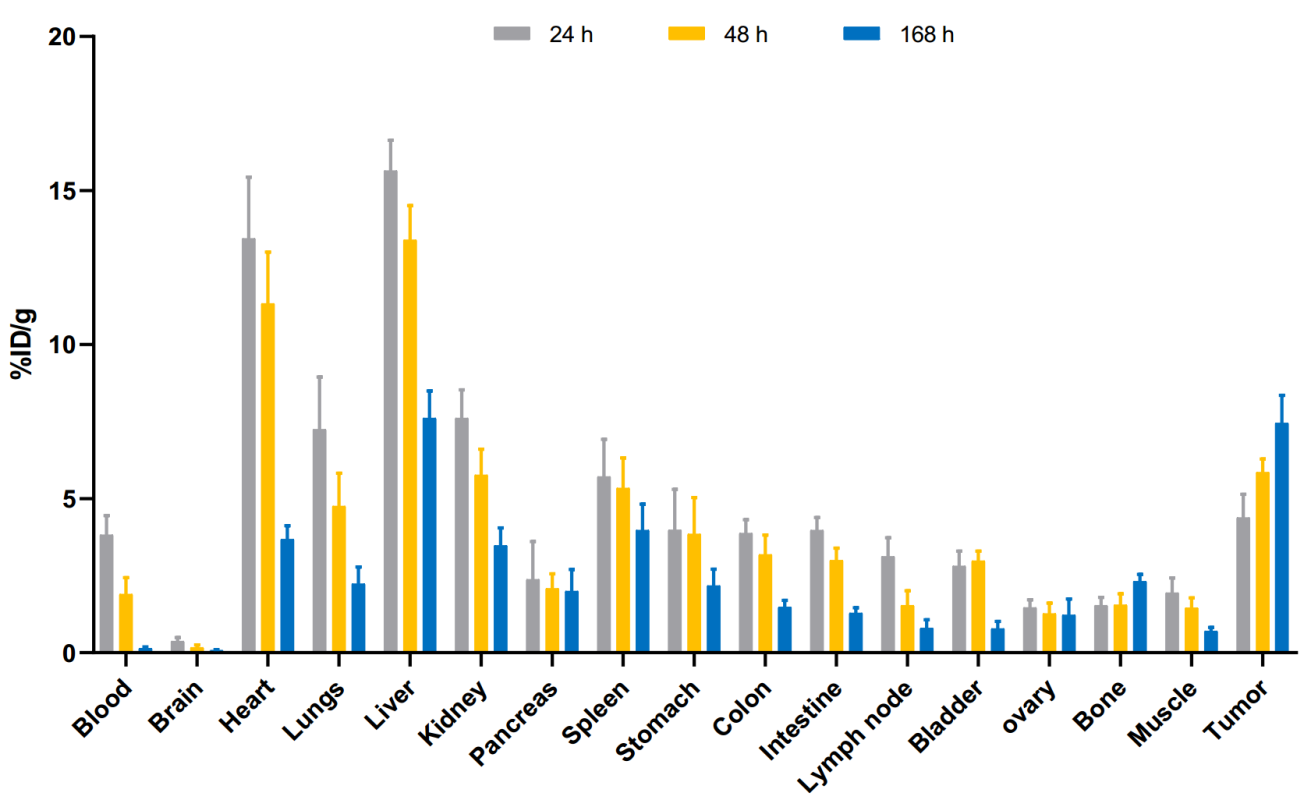 Figure 4. 施用放射性示蹤劑后24小時、48小時和168小時,[89Zr] Zr-DFO-BCMAh230430 在人類 MM.1S皮下異種移植物(n=4)中的生物分布。