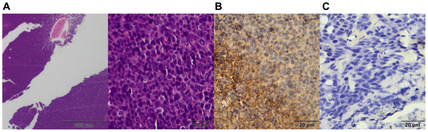 Figure 5. A: MM.1S腫瘤組織HE染色; B: MM.1S腫瘤組織免疫組化染色; C: KYSE520腫瘤組織免疫組化染色
