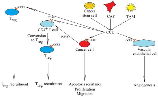 在腫瘤微環(huán)境中,由腫瘤干細(xì)胞,CAF(carcinoma-associated fibroblasts)和TAM(tumor-associated macrophages)分泌的CCL1通過作用于不同細(xì)胞表面的CCR8受體,發(fā)揮其功能: