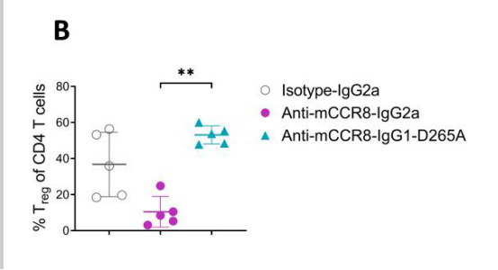 該研究中,為了確定CCR8阻斷相對于抗體介導(dǎo)的Treg細(xì)胞耗竭在抗腫瘤免疫中的相對貢獻(xiàn),用anti-mCCR8-IgG2a(Fc區(qū)域?yàn)閺?qiáng)ADCC)和anti-mCCR8-IgG1-D265A(Fc區(qū)域?yàn)槿魽DCC)治療MC38腫瘤小鼠??筸CCR8-IgG2a治療可誘導(dǎo)明顯的腫瘤消退,而抗CCR8-mIgG1-D265A治療對腫瘤生長無明顯影響(圖5A)。重要的是,在使用抗anti-mCCR8-IgG2a治療后,腫瘤中treg的頻率降低了75%(圖5B)。