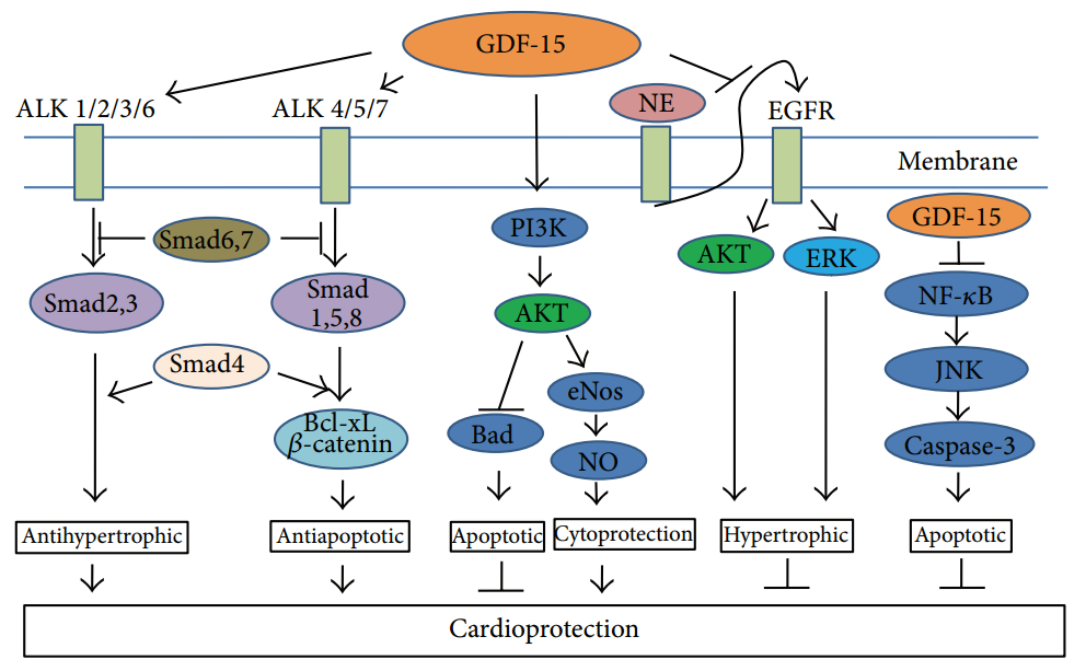 GDF超家族的成員刺激特定受體,導致調節(jié)免疫和其他細胞反應的細胞內信號傳導。GDF-15 對 GFRAL (B) 具有高親和力,GFRAL 是 TGF-β 超家族配體不同類別受體的遠親,并與 RET(受體酪氨酸激酶)形成復合物,然后激活細胞內信號通路,促進各種生物學效應。GDF-15 刺激 Pl3K/Akt/eNOS/NO 信號通路,保護內皮細胞免受 ROS(活性氧)侵害。 GDF-15 還通過抑制 NF-kB/JNK 激活來保護內皮細胞免受高葡萄糖誘導的細胞損傷。GDF-15 通過磷酸化 ERK、AKT 和 PLC-y 來刺激肥大、細胞增殖和分化。p53 蛋白由氧化應激誘導并對靶細胞具有抗凋亡作用,是 GDF-15 的直接分子生物學靶點。受 p53 蛋白表達抑制的促生存蛋白 ATF3 與 GDF-15 的細胞存活作用有關。GDF-15 已證明可通過 ALK 1-7 和磷酸化 Smad2/3 和Smad1/5/8 來保護心臟等[2]。