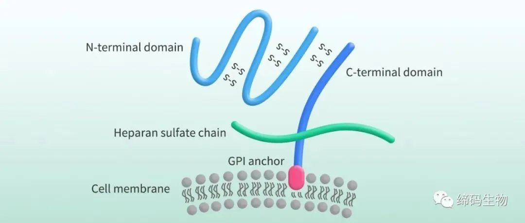 GPC3,又名DGSX、GTR2-2、MXR7、OCI-5,是由GPC3基因編碼的硫酸乙酰肝素 (HS)蛋白聚糖家族的成員。GPC3基因位于染色體Xq26上,其編碼的蛋白包含一個(gè)580個(gè)氨基酸的核心蛋白和兩條位于C-端的HS鏈。GPC3核心蛋白通過糖基磷脂酰肌醇(GPI)錨連在細(xì)胞膜表面上,可被切割成大約40KDa的N端可溶性蛋白(sGPC3)和30KDa C端膜蛋白。切割后的sGPC3可以從癌細(xì)胞釋放到循環(huán)中(Figure 1)。