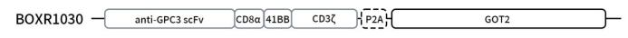 BOXR1030是由SOTIOBiotech基于專有的BOXR?平臺(tái),用于治療表達(dá)GPC3的各種實(shí)體瘤。BOXR1030的結(jié)構(gòu)如下圖所示,它是一款人源化GPC3靶向scFv、4-1BB共刺激域和CD3ζ信號(hào)域的二代CAR。同時(shí),利用P2A序列連接密碼子優(yōu)化的GOT2,旨在評(píng)估T細(xì)胞代謝對(duì)CAR-T細(xì)胞功能的影響,而后再通過γ逆轉(zhuǎn)錄病毒轉(zhuǎn)導(dǎo)生成CAR-T細(xì)胞。臨床前研究表明,與傳統(tǒng)的GPC3 CAR-T細(xì)胞相比,在缺氧和低葡萄糖條件下,BOXR1030 T細(xì)胞增殖得到改善,而且具有更好的腫瘤殺傷能力;此外,在動(dòng)物分離出的腫瘤浸潤(rùn)淋巴細(xì)胞中,與對(duì)照細(xì)胞相比,BOXR1030對(duì)功能障礙的抵抗力更強(qiáng),并且衰竭的標(biāo)志物更少。BOXR1030的初始適應(yīng)癥包括肝細(xì)胞癌、肺鱗狀細(xì)胞癌和粘液樣/圓形細(xì)胞脂肪肉瘤,目前已進(jìn)入臨床,正在進(jìn)行1/2期DUET-01臨床試驗(yàn)(NCT05120271),該項(xiàng)臨床試驗(yàn)正處于招募狀態(tài)。