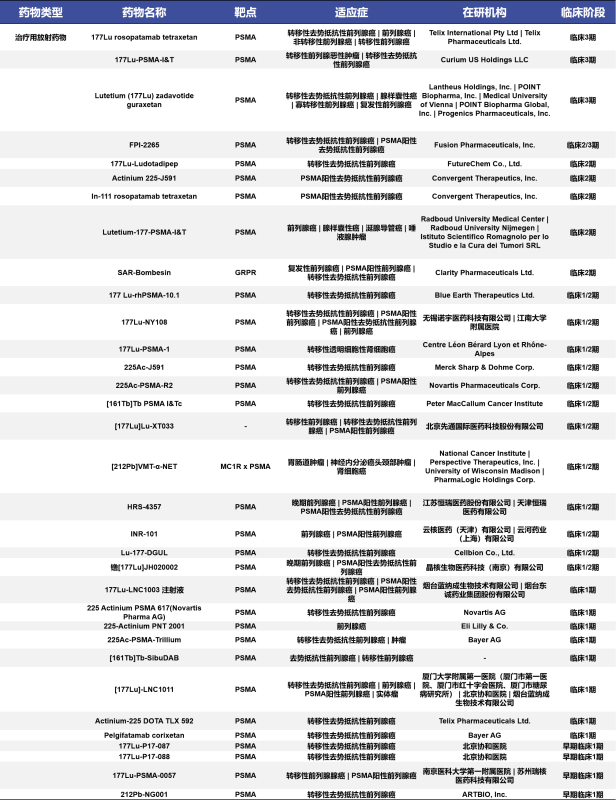 臨床階段的治療用放射藥物數(shù)量超過一半集中在臨床1/2期和臨床1期,占比達60%,這些藥物所針對的22個適應(yīng)癥中,排名前三的是轉(zhuǎn)移性去勢抵抗性前列腺癌、PSMA陽性去勢抵抗性前列腺癌、前列腺癌,分別為11、2、1,占總體33%、6.1%、3.0%。而這些藥物大多使用177Lu作為放射性標(biāo)記的化合物。(詳見附表2)