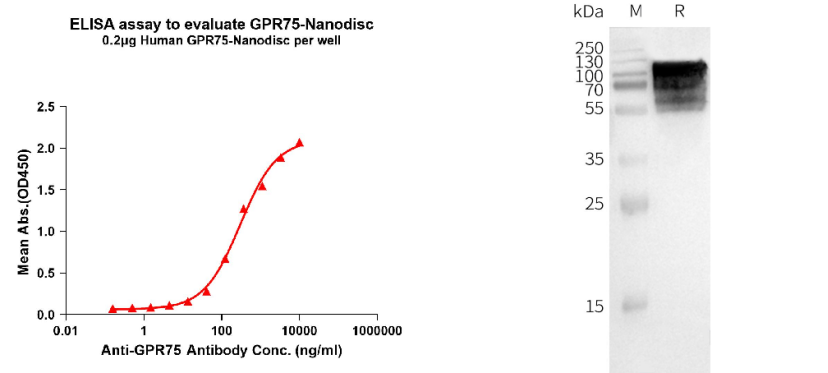 Left: Elisa plates were pre-coated with Flag Tag GPR75-Nanodisc and anti-GPR75 monoclonal antibody (DMC100368); Right: WB analysis of Human GPR75-Nanodisc with anti-Flag monoclonal antibody.