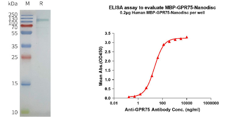 Left: Human MBP-GPR75-Nanodisc with N-MBP Tag, C-Flag Tag on SDS-PAGE; Right: Elisa plates were pre-coated with N-MBP Tag, C-Flag Tag MBP-GPR75-Nanodisc and anti-GPR75 monoclonal antibody (DMC100368).