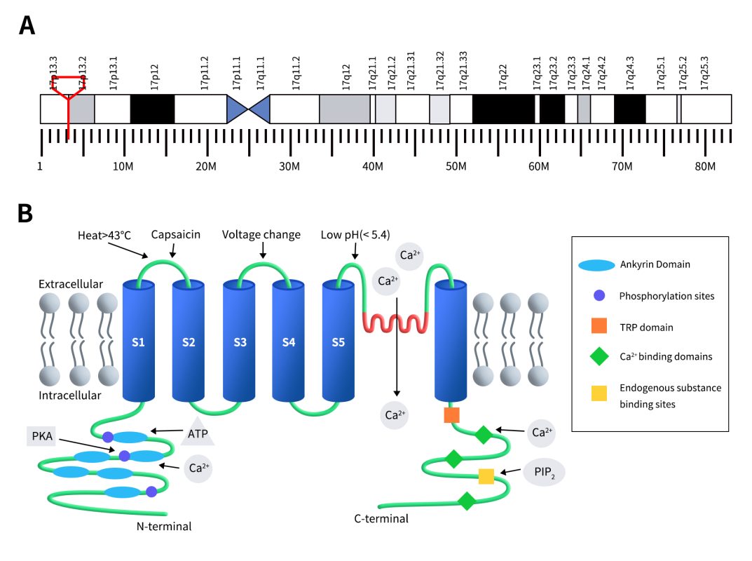 Figure 1. The gene location (A) and protein structure of TRPV1 (B) [5]