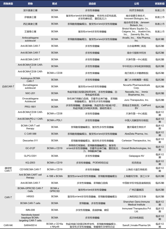 CAR T細(xì)胞靶向BCMA療法分為自體BCMA、通用型BCMA、同種異體BCMA和CAR-NK等,目前已上市和處于臨床階段的有77項(xiàng),其中處于早期臨床1期和臨床1期的有49項(xiàng),下表中重點(diǎn)展示了已上市、臨床1/2期、臨床2期及臨床3期的BCMA CAR-T療法信息。適應(yīng)癥涉及到自身免疫疾病的可以點(diǎn)擊閱讀:靶向BCMA療法在自身免疫性疾病中的研究進(jìn)展>>