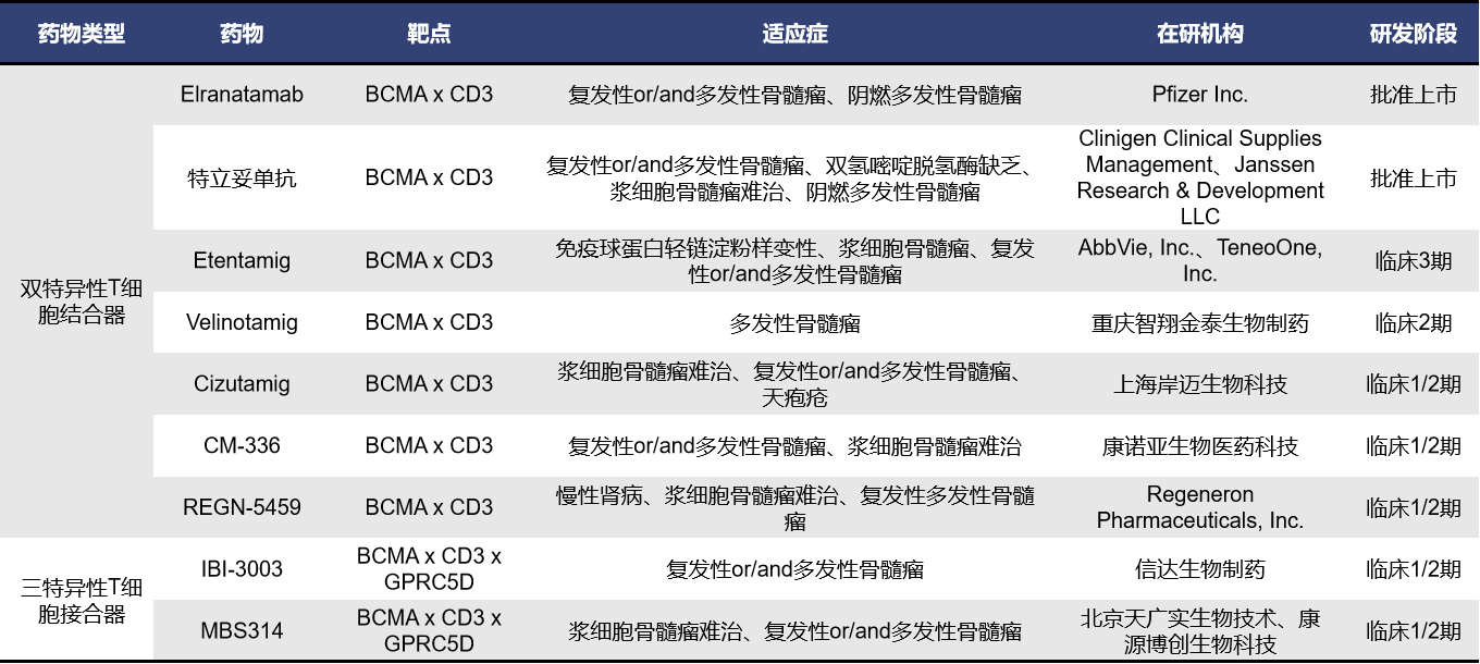 目前,全球靶向BCMA的T細(xì)胞結(jié)合器療法主要分兩種,雙特異性T細(xì)胞結(jié)合器和三特異性T細(xì)胞結(jié)合器。不完全統(tǒng)計(jì),靶向BCMA已上市的T細(xì)胞結(jié)合器療法有2款,處于臨床階段的有15款,其中處于臨床1期的有8款,下表中重點(diǎn)展示了已上市及處于臨床1/2期、2期及3期的T細(xì)胞結(jié)合器療法。