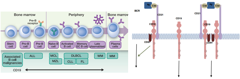 CD19為I型單次跨膜糖蛋白,在B細胞發(fā)育早期表達,并在成熟B細胞階段持續(xù)表達,是B細胞最可靠的表面生物標志物之一。同時CD19與補體受體CD21,四跨膜蛋白CD81一起,是成熟B細胞表面上多分子復合物的主要信號傳導成分,在維持體液,抗原誘導的反應和耐受誘導之間的平衡中起著關鍵作用。