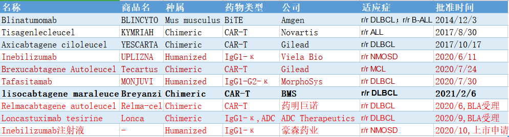 同時2020年也是靶向CD19生物藥獲批的收獲年:3款獲批(2款單抗,1款CAR-T),另有一款ADC、一款CAR-T藥物已提交BLA獲受理,同時豪森藥業(yè)引進的Inebilizumab注射液(CD19單抗,Viela Bio)上市申請也獲受理。2021年2月5日,?FDA又批準百時美施貴寶的Liso-cel上市(第四款獲批CAR-T細胞療法),這也是第四款靶向CD19靶點的CAR-T細胞療法。這么密集的獲批,也給了后來入局者非常大的壓力。??