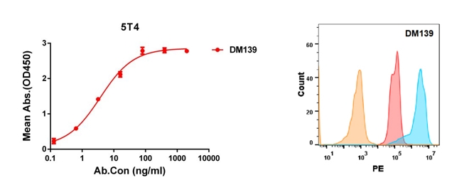 Figure 3. Validation data of Anti-5T4 antibody. Human 5T4 protein, His tagged protein can bind Rabbit anti-5T4 monoclonal antibody in a linear range of 0.1-16 ng/ml (left); 5T4 protein is highly expressed on the surface of HEK293 cell membrane (right).