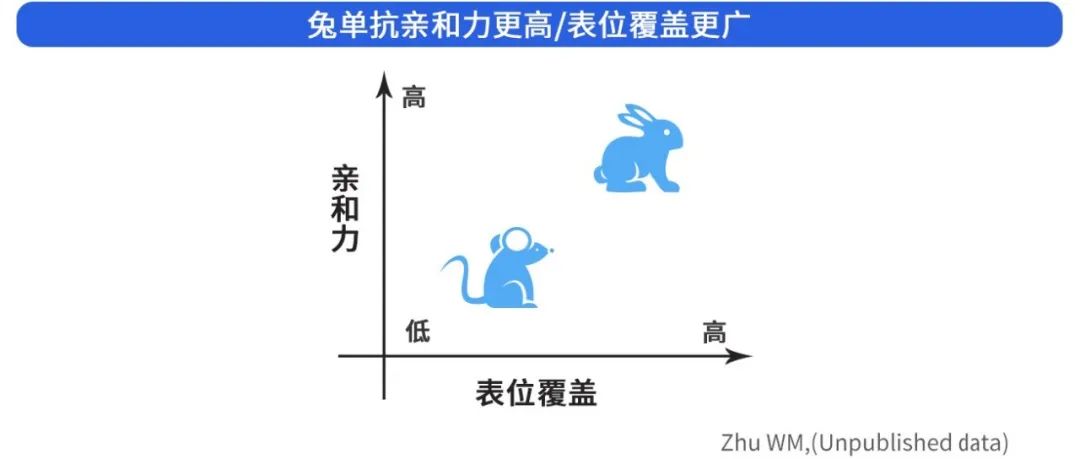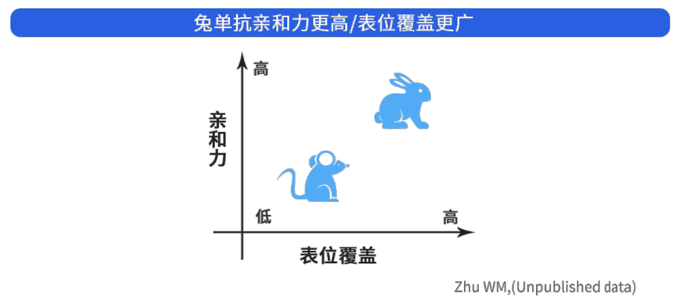 針對小分子和半抗原,小鼠等嚙齒動物不會產(chǎn)生明顯的免疫反應,而兔能產(chǎn)生好的免疫反應,因此針對弱免疫原性的抗原,兔單抗就是更好的選擇。