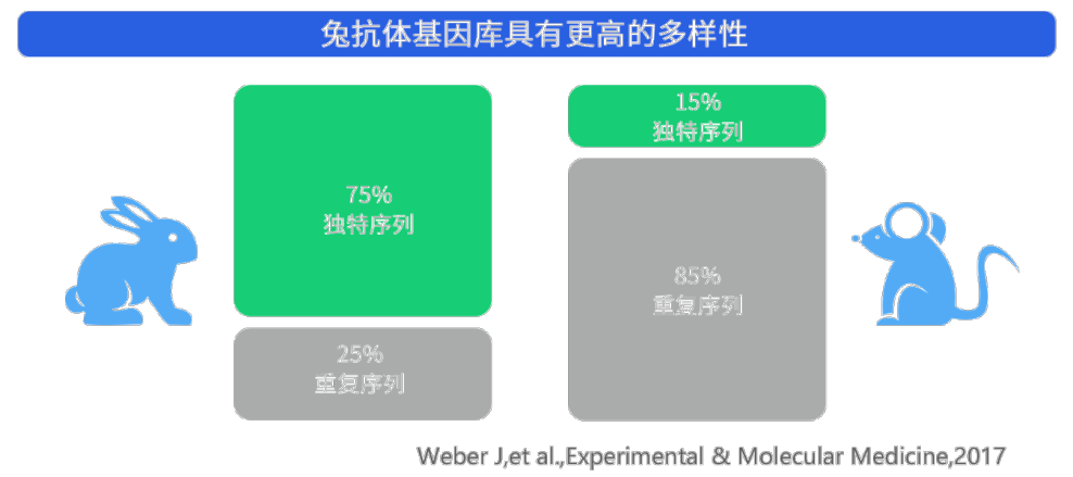 與小鼠相比,兔擁有更豐富的免疫抗體譜,這是由于兔的免疫抗體譜系產(chǎn)生機制除了有體細胞超突變過程,兔還有一個基因轉(zhuǎn)換機制。也正因如此,兔抗甚至可以識別部分鼠抗不能識別的抗原表位。兔抗體在區(qū)分諸如表位變異(如修飾)、突變和構(gòu)象變化等細微差別方面也更具優(yōu)勢。