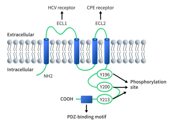 人的CLDN6基因位于染色體16p13.3上,由220個(gè)氨基酸組成,分子量為23kDa,包含三個(gè)外顯子。如圖1所示,與其他CLDN一致,CLDN6具有四個(gè)跨膜結(jié)構(gòu)域、一個(gè)短的胞質(zhì)N端、一個(gè)C端胞質(zhì)結(jié)構(gòu)域、兩個(gè)胞外結(jié)構(gòu)域(較大的ECL1和一個(gè)較小的ECL2)和一個(gè)短的胞內(nèi)環(huán)。ECL1和細(xì)胞質(zhì)C末端的PDZ結(jié)合域是CLDN的典型結(jié)構(gòu)域。ECL1 在細(xì)胞之間交叉形成離子選擇性孔。不同claudins ECL1區(qū)上氨基酸位置和所帶電荷都有很大差異,C末端序列的不同也是區(qū)分claudin各個(gè)成員的另外一個(gè)差異點(diǎn)。C末端的PDZ結(jié)合序列和一些潛在的磷酸化位點(diǎn)能夠使claudin與胞質(zhì)內(nèi)含PDZ結(jié)構(gòu)的ZO-1、ZO-2、ZO-3、MUPP1等直接作用于其特定的結(jié)構(gòu)域,ZO-1、ZO-2又可直接與肌動(dòng)蛋白絲相連,從而使TJ蛋白與細(xì)胞內(nèi)骨架結(jié)構(gòu)形成穩(wěn)定的系統(tǒng)。