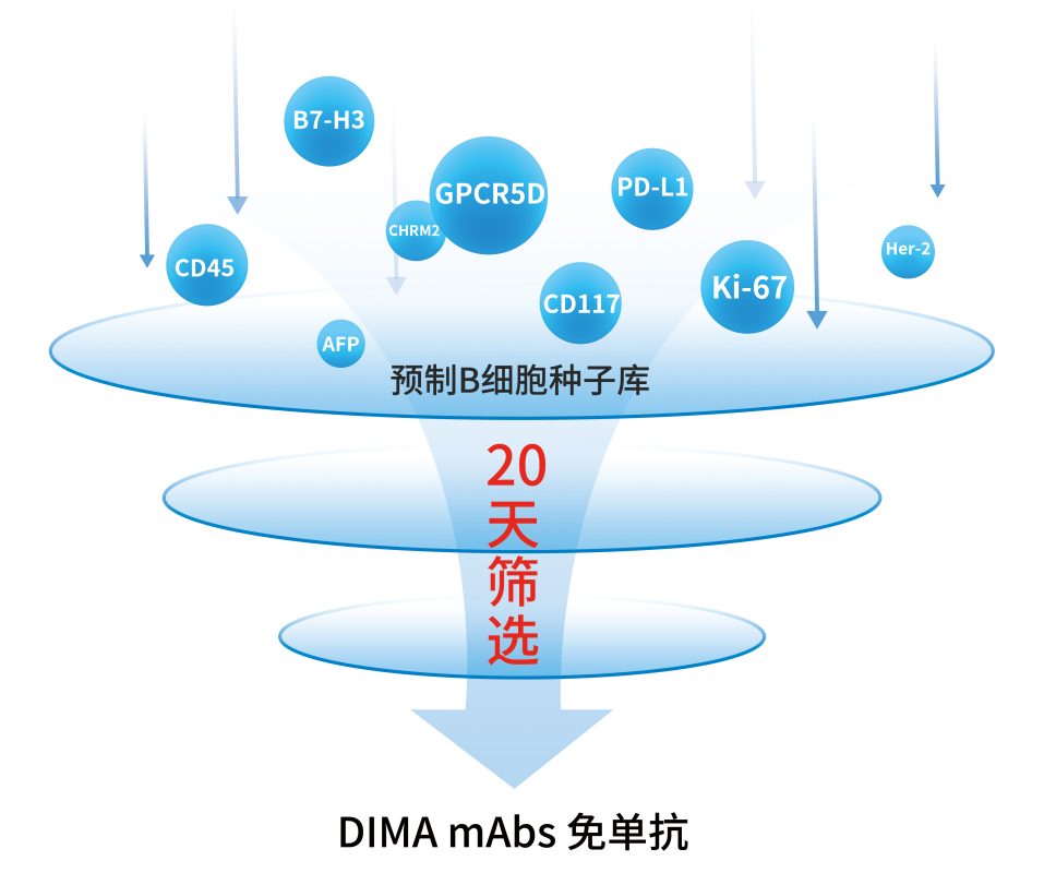 締碼生物擁有獨創(chuàng)的DIMA mAbs重組單克隆抗體開發(fā)平臺,可以在完成動物免疫后直接從外周血中獲取陽性B細胞并克隆抗體基因序列。從單只免疫動物中我們可以得到上萬個靶點結合陽性B細胞克隆,從中能夠更為高效的篩選出具有高特異性、高親和力重組單克隆抗體。