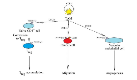 它還通過受體PITPNM3和CCR8引起癌細胞遷移和侵襲。CCL18通過作用于內皮細胞上的PITPNM3而在血管生成中起重要作用。它還導致na?ve CD4+ T細胞進入腫瘤生態(tài)位和 CD4+ T細胞向Treg細胞的轉化。