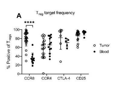 CCR8在患者腫瘤組織中的FOXP3+ Tregs上高表達,而在患者血液中顯著降低。這與CCR4、CTLA-4和CD25等靶點不同,它們在腫瘤和血液的Treg上的表達差異不大(圖4)。CCR8在腫瘤部位Treg細胞上的特異性表達,使得開發(fā)CCR8靶向性的單克隆抗體藥物則有望特異性地抑制腫瘤部位的Treg的功能,有助于癌癥治療。