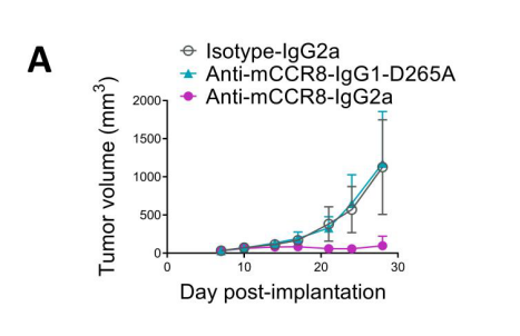 該研究中,為了確定CCR8阻斷相對于抗體介導的Treg細胞耗竭在抗腫瘤免疫中的相對貢獻,用anti-mCCR8-IgG2a(Fc區(qū)域為強ADCC)和anti-mCCR8-IgG1-D265A(Fc區(qū)域為弱ADCC)治療MC38腫瘤小鼠??筸CCR8-IgG2a治療可誘導明顯的腫瘤消退,而抗CCR8-mIgG1-D265A治療對腫瘤生長無明顯影響(圖5A)。重要的是,在使用抗anti-mCCR8-IgG2a治療后,腫瘤中treg的頻率降低了75%(圖5B)。