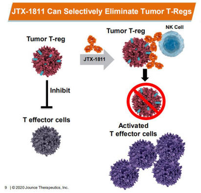 JTX-1811是一種靶向CCR8的單克隆抗體,該項目已經獲得了FDA的臨床試驗許可(試驗登記號:NCT05007782)。當JTX-1811與CCR8結合后時,它可以通過增強的抗體依賴性細胞毒性機制靶向清除具有免疫抑制能力的腫瘤浸潤性調節(jié)性Treg細胞以增強抗腫瘤免疫。