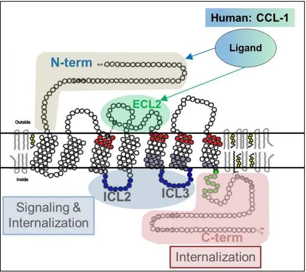 人CCL1是人CCR8的主要配體,同時與CCR8細胞外環(huán)2 (ECL2)和CCR8的N端結構域結合。(圖1)