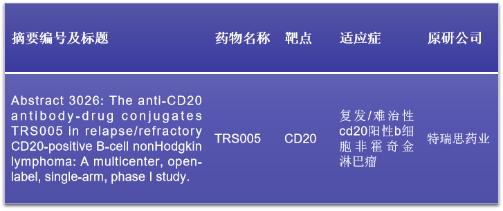 CD20是B細(xì)胞的標(biāo)志物,屬于跨膜4結(jié)構(gòu)域家族A(MS4A)蛋白家族,在正常和約95%惡性B淋巴細(xì)胞表面表達(dá),但在造血干細(xì)胞、血漿細(xì)胞和其他正常組織中不表達(dá)。此次會(huì)議上,特瑞思藥業(yè)將展示CD20 ADC藥物TRS005在復(fù)發(fā)/難治性cd20陽性b細(xì)胞非霍奇金淋巴瘤中的I期臨床研究數(shù)據(jù)。