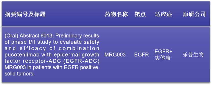 EGFR,也稱為表皮生長因子受體,是一種跨膜糖蛋白、酪氨酸蛋白激酶ERBB受體家族的成員,是抗腫瘤領(lǐng)域最經(jīng)典的靶點(diǎn)。盡管目前上市的藥物也有很多,但隨著耐藥的不斷出現(xiàn),針對EGFR的靶點(diǎn)新藥也不斷迭代。樂普生物在此次會(huì)議上展示EGFR ADC藥物MRG003與pucotenlimab聯(lián)合用藥在EGFR+實(shí)體瘤患者中安全性和療效的初步結(jié)果。