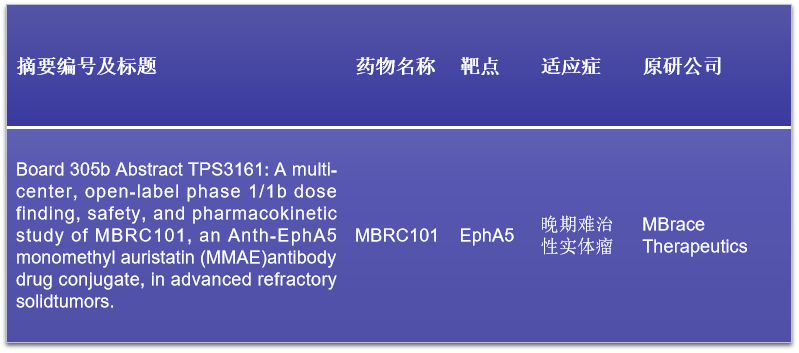 EphA5是一種受體酪氨酸激酶,其存在于多種癌癥中,比如于乳腺癌、非小細(xì)胞肺癌(NSCLC)、結(jié)直腸癌、胃癌和胰腺癌。MBrace Therapeutics將在此次ASCO會(huì)議上展示其EphA5 ADC藥物MBRC101的一項(xiàng)臨床I/1b試驗(yàn)結(jié)果。