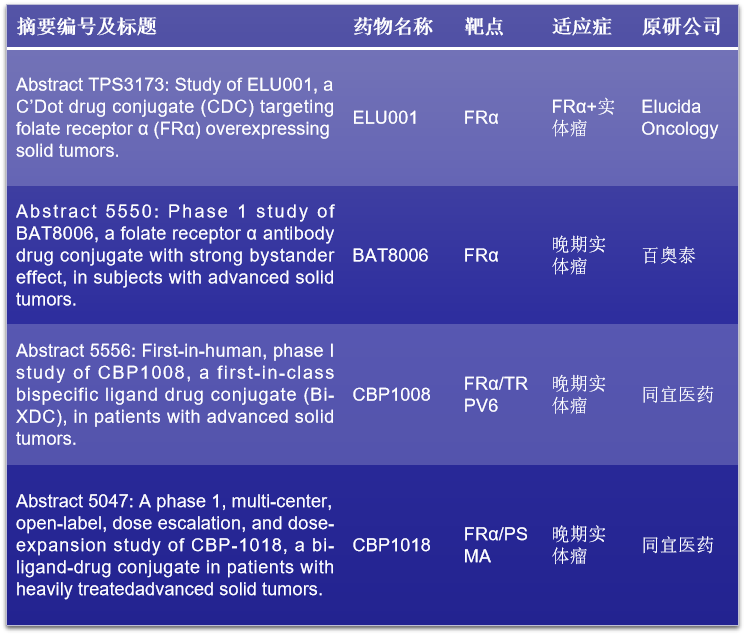FRα(葉酸受體α)屬于葉酸受體家族,由FOLR1基因編碼。FRα現(xiàn)已經(jīng)被證實(shí)在正常細(xì)胞中幾乎不表達(dá),在實(shí)體瘤中有廣泛高表達(dá)。在2024 ASCO會(huì)議上,Elucida Oncology將公布ELU001在FRα+實(shí)體瘤中的研究結(jié)果。百奧泰將公布BAT8006在晚期實(shí)體瘤患者的臨床I期研究結(jié)果。同宜醫(yī)藥將公布兩項(xiàng)關(guān)于FRα的雙特異性ADC藥物I期臨床數(shù)據(jù),涉及的藥物包括是CBP1008和CBP1018,分別靶向FRα/TRPV6和FRα/PSMA。點(diǎn)擊閱讀更多關(guān)于FRα>>