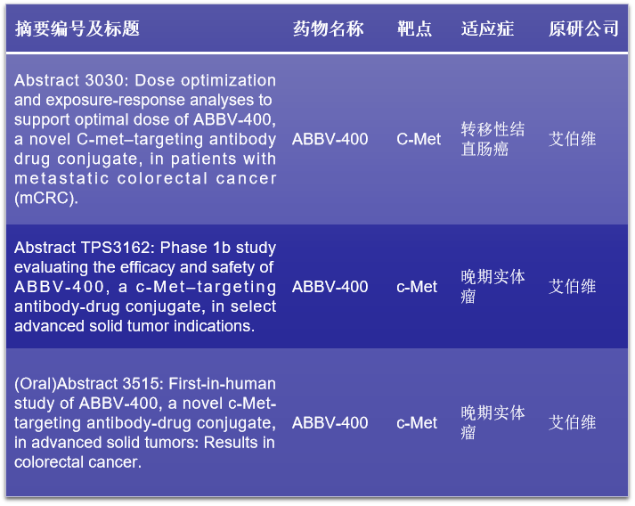 c-Met,又稱為MET,是肝細(xì)胞生長因子(HGF)的受體酪氨酸激酶受體。研究表明,c-Met與HGF結(jié)合后可參與調(diào)節(jié)包括分化、增殖、上皮細(xì)胞運(yùn)動(dòng)、血管生成和上皮間質(zhì)轉(zhuǎn)化(EMT)等多種細(xì)胞過程。HGF/c-Met信號通路異常會(huì)導(dǎo)致癌癥的發(fā)生發(fā)展。在2024?ASCO會(huì)議上,艾伯維將公布三項(xiàng)關(guān)于c-Met ADC藥物ABBV-400的研究結(jié)果,其中有一項(xiàng)口頭報(bào)告??陬^報(bào)告的內(nèi)容是關(guān)于ABBV-400在晚期結(jié)直腸癌患者中的首次人體研究結(jié)果。另外兩項(xiàng)分別是:用于轉(zhuǎn)移性結(jié)直腸癌(mCRC)患者的劑量優(yōu)化和暴露反應(yīng)分析支持最佳劑量;在晚期實(shí)體瘤適應(yīng)癥中的療效和安全性臨床I期結(jié)果。