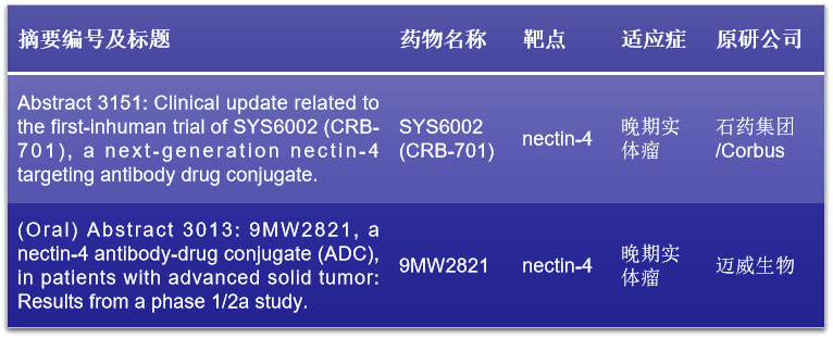 nectin-4屬于Nectin家族,是Ca2+非依賴性免疫球蛋白超家族(CAMs)細(xì)胞粘附分子,在多種人類惡性腫瘤中過表達(dá)。這種異常表達(dá)與癌癥進(jìn)展和預(yù)后不良有關(guān)。在2024 ASCO會(huì)議上預(yù)計(jì)會(huì)展示2項(xiàng)關(guān)于 nectin-4 ADC藥物的臨床數(shù)據(jù),其中一項(xiàng)是口頭報(bào)告。口頭報(bào)告的內(nèi)容是關(guān)于由邁威生物開發(fā)的9MW2821;另一項(xiàng)是由石藥集團(tuán)和Corbus聯(lián)合開發(fā)的SYS6002 (CRB-701)。