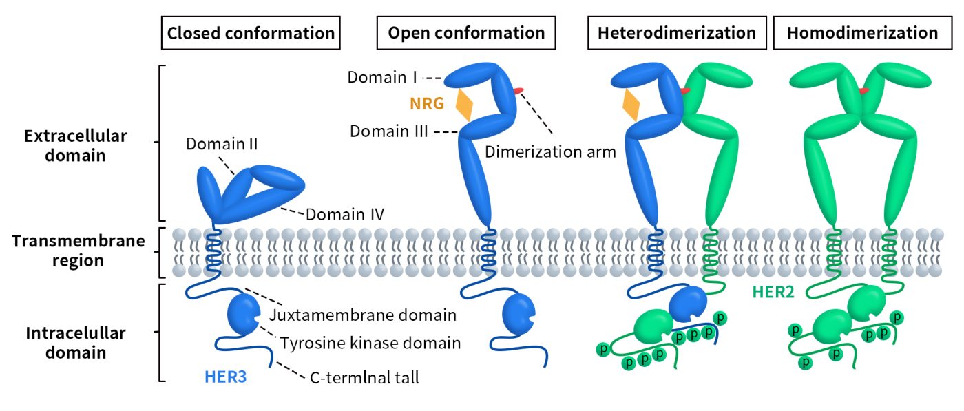 HER3能與配體heregulin和神經(jīng)調(diào)節(jié)蛋白(NRG2)結(jié)合。如Figure 1所示,在沒有配體的情況下,亞結(jié)構(gòu)域II和IV之間的直接分子內(nèi)相互作用使HER3處于無活性構(gòu)象;當(dāng)配體與子亞結(jié)構(gòu)域I和III結(jié)合時,會誘發(fā)HER3胞外結(jié)構(gòu)域的構(gòu)象變化,使位于亞結(jié)構(gòu)域II中的二聚化臂暴露在外。二聚化臂可以使HER3與另一個ERBB RTK成員或HER3單體進(jìn)行分子間互作,形成異二聚體或同質(zhì)二聚體[7][8]。