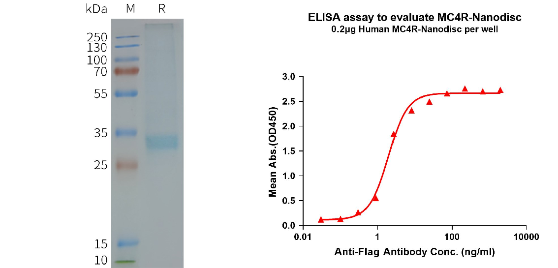 [Right] ELISA plates were pre-coated with Flag Tag MC4R-Nanodisc (0.2μg/per well). The EC50 for anti-Flag monoclonal antibody binding with MC4R-Nanodisc is 1.957ng/ml.