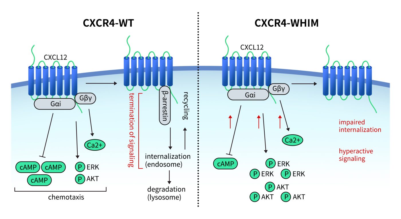 Fig 3.Schematic representation of signaling pathways activated downstream of the CXCR4 receptor and the effect of CXCR4WHIM mutations.[3]