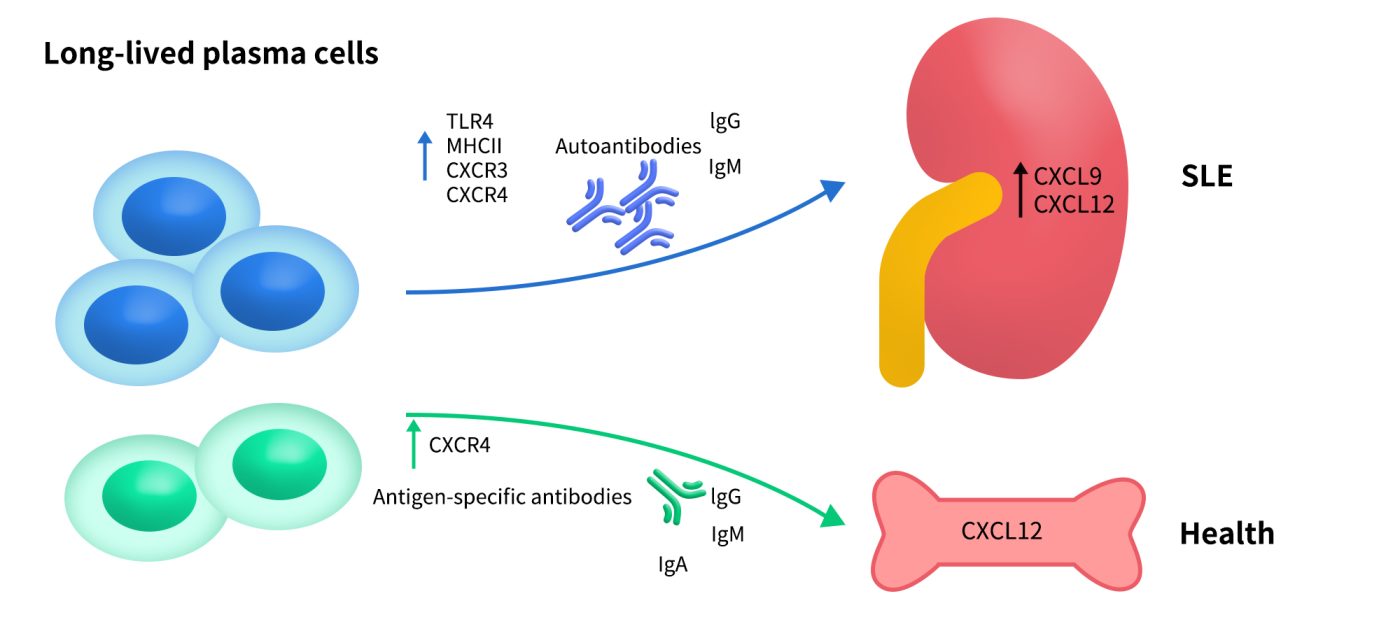 Fig 4. Long-lived plasma cells in SLE. The upregulated CXCL9 and CXCL12 in the inflamed organs of SLE, such as kidney, may recruit the autoreactive long-lived plasma cells to maintain local autoimmune inflammation.[4]