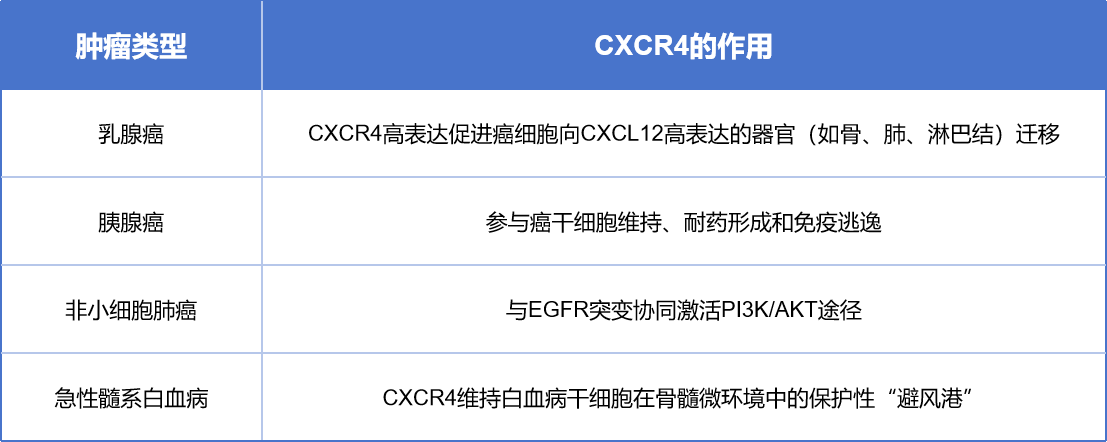 對(duì)于這些腫瘤的治療,目前的策略是使用CXCR4拮抗劑(如Plerixafor、Motixafortide)打破腫瘤細(xì)胞與骨髓基質(zhì)的粘附,有助于化療敏感性恢復(fù)、腫瘤干細(xì)胞動(dòng)員、增強(qiáng)免疫檢查點(diǎn)抑制劑效應(yīng)。