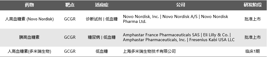 目前處于臨床階段的靶向GCGR的激素類藥物有3種,且都是單靶向,有兩款已批準(zhǔn)上市,分別是諾和諾德的GCGR激動(dòng)劑人高血糖素 (Novo Nordisk)和禮來(lái)的GCGR激動(dòng)劑胰高血糖素。還有一款是上海多米瑞的GCGR激動(dòng)劑人高血糖素(多米瑞生物),目前處于臨床1期階段。