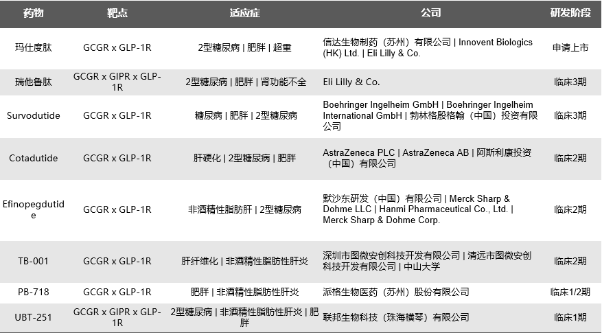 截至目前,臨床上靶向GCGR的合成多肽類藥物共8種。這些藥物所針對(duì)的適應(yīng)癥多以肥胖和糖尿病為主,包含GCGR x GLP-1R雙重激動(dòng)劑和GCGRx GIPR x GLP-1R其中只有信達(dá)生物/禮來(lái)的GLP-1R x GCGR雙重激動(dòng)劑瑪仕度肽完成臨床試驗(yàn)并申請(qǐng)上市。處于臨床3期的藥物有兩款,分別是禮來(lái)的GCGR x GIPR x GLP-1R三重激動(dòng)劑瑞他魯肽和勃林格殷格翰的GCGR x GLP-1R雙激動(dòng)劑Survodutide;處于臨床2期的藥物有3款,分別是阿斯利康的GCGR x GLP-1R雙重激動(dòng)劑Cotadutide,默沙東的GCGR x GLP-1R雙重激動(dòng)劑Efinopegdutide,以及圖微安創(chuàng)和中山大學(xué)聯(lián)合研發(fā)的GCGR x GLP-1R雙重激動(dòng)劑TB-001;處于1期臨床的有2款,分別是派格生物醫(yī)藥的GCGR x GLP-1R雙重激動(dòng)劑PB-718和聯(lián)邦生物的GCGR x GIPR x GLP-1R三重激動(dòng)劑UBT-251。