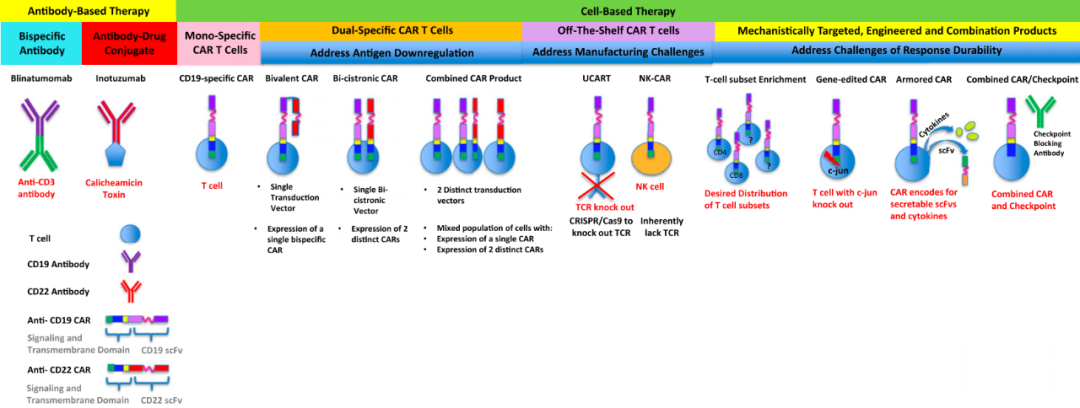 針對B細(xì)胞相關(guān)血液腫瘤疾病,圍繞CD19靶點(diǎn)開發(fā)了眾多類型治療性藥物(單抗、雙抗、ADC、CAR-T),但主流還是扎堆在CAR-T療法上,總體是在降本增效上探索不同設(shè)計(jì)方案。