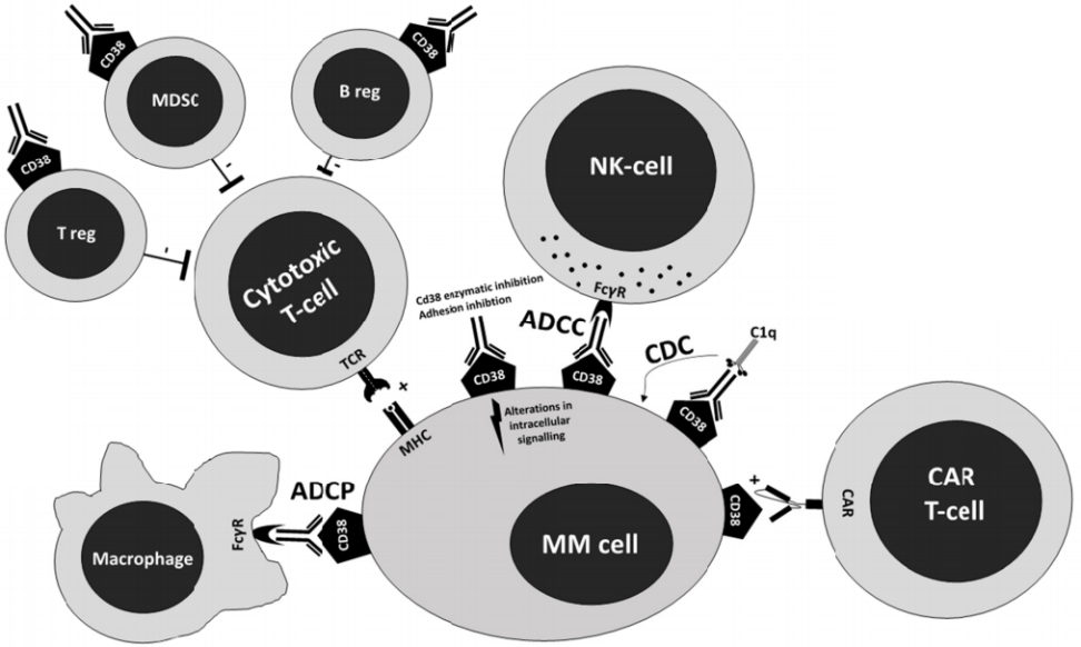 基于CD38在80-100%MM患者的惡性瘤細(xì)胞上表達(dá)非常高且均勻,是新型治療策略的良好靶標(biāo)。抗體藥物與MM細(xì)胞表達(dá)的CD38結(jié)合,可通過(guò)補(bǔ)體依賴的細(xì)胞毒作用(CDC)、抗體依賴性細(xì)胞介導(dǎo)的細(xì)胞毒作用(ADCC)和抗體依賴性細(xì)胞吞噬作用(ADCP)、細(xì)胞凋亡、以及Fcγ受體等多種免疫相關(guān)機(jī)制誘導(dǎo)腫瘤細(xì)胞凋亡。?