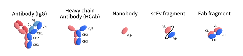 上世紀(jì)80年代末,比利時科學(xué)家Dr. Hamers的學(xué)生們偶然發(fā)現(xiàn)了馴化駱駝的血清中除了傳統(tǒng)的IgG1型抗體之外,還含有大約75%的只有一條重鏈卻沒有輕鏈的抗體,從此向世人揭示一種新型抗體:單重鏈抗體 (Heavy chain-only antibodies, HCAbs)。 這種抗體在羊駝 (Llama and Alpaca) 中也有相當(dāng)比例的表達(dá)。隨后單重鏈抗體的 N-terminal domain 被證明可以直接同抗原結(jié)合,這個類似于人類 IgG1 VH domain 的區(qū)域被命名為單域抗體 (single domain antibody, sdAb), VHH,或納米抗體 (Nanobody),并以各種形式應(yīng)用在抗體藥物開發(fā)中。
