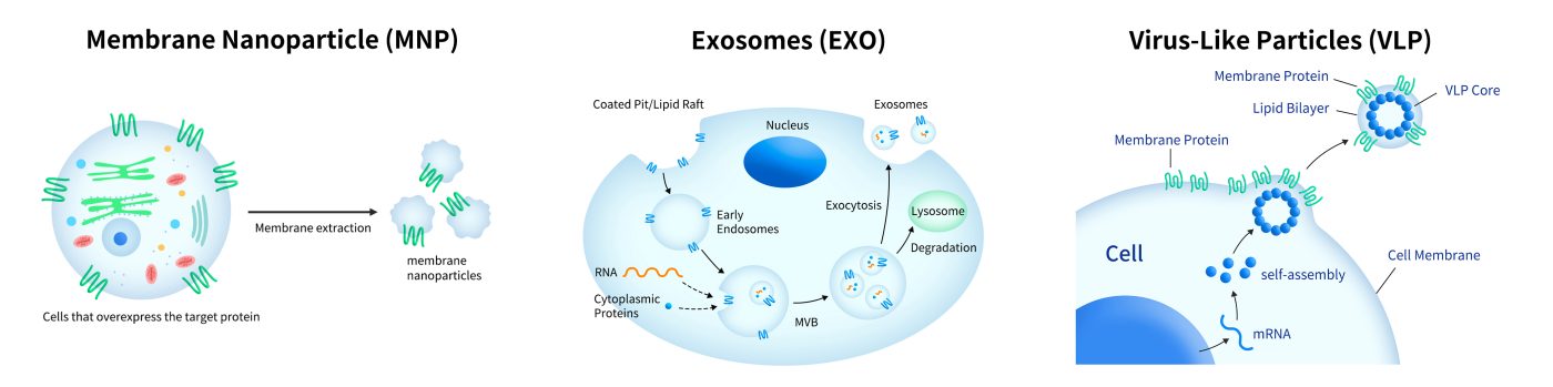 為助力藥物研發(fā),解決跨膜蛋白靶點(diǎn)開發(fā)過程中抗原制備的難題,締碼生物專門搭建了多個(gè)跨膜蛋白全長(zhǎng)表達(dá)平臺(tái)。依據(jù)不同制備方法平臺(tái)可分為非純化膜蛋白和純化膜蛋白兩類平臺(tái)。非純化膜蛋白平臺(tái)包括:MNP(納米膜顆粒)、VLP和外泌體平臺(tái)。純化膜蛋白平臺(tái)包括:Synthetic Nanodisc、MSP Nanodisc、PeptiNanodisc和去垢劑平臺(tái)。