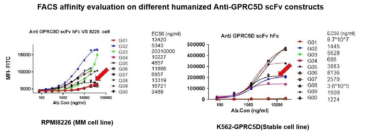 G00 (The red arrow is the construct from reference CAR (MARCH109, which is in clinical trial); G01-G09 are humanized molecules from DlMA Biotech LTD.